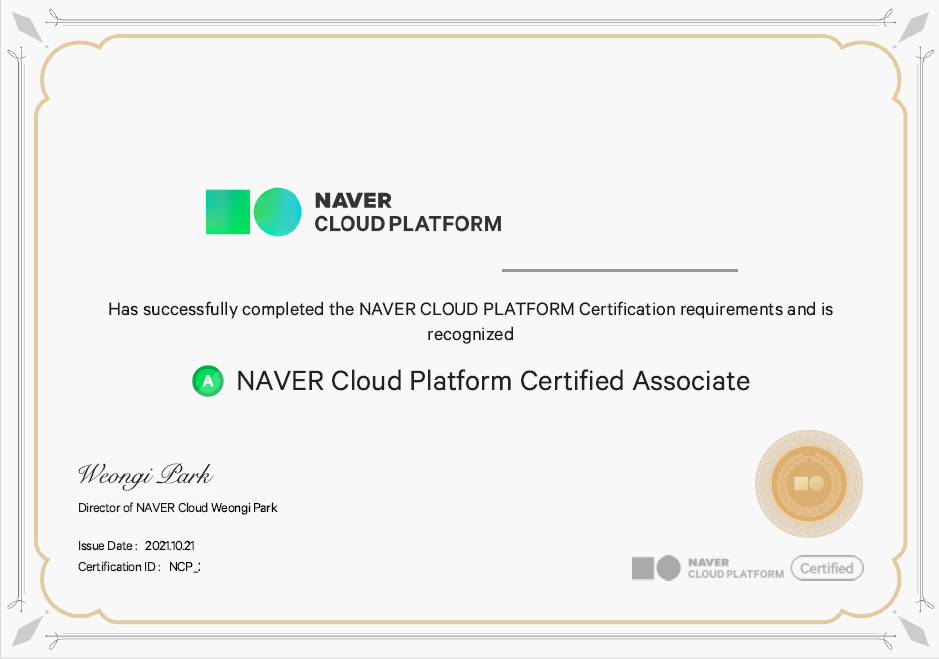 Naver Cloud Platform Certified NCP 자격증 취득 하였습니다.