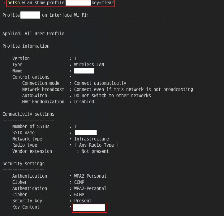 netsh wlan show profile "확인하고자 하는 프로필명" key=clear