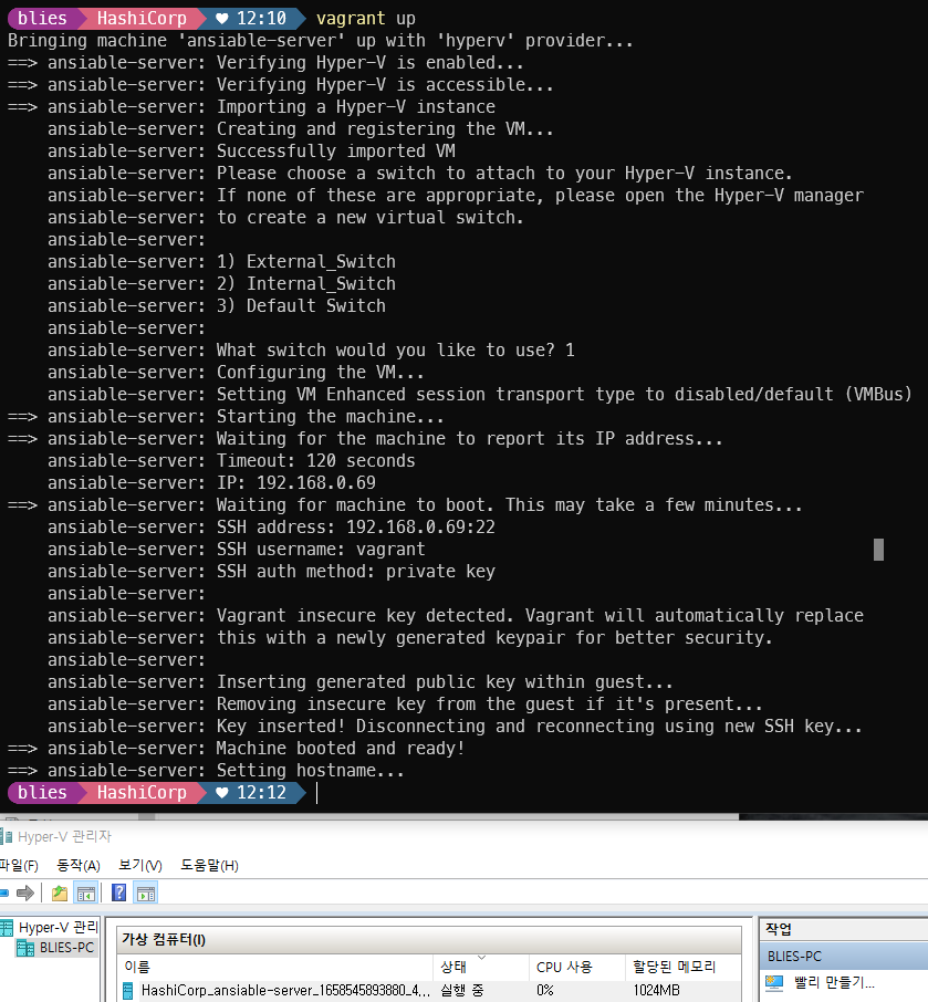 책에서는 VirtualBox를 사용해서 혹시 hyper-v를 지원안하면 다시 해야하나 싶었는데 다행히 hyper-v도 정상적으로 지원하는것으로 확인, 스위치가 여러개 설정되있을 경우 중간에 선택해야 하는 과정 추가