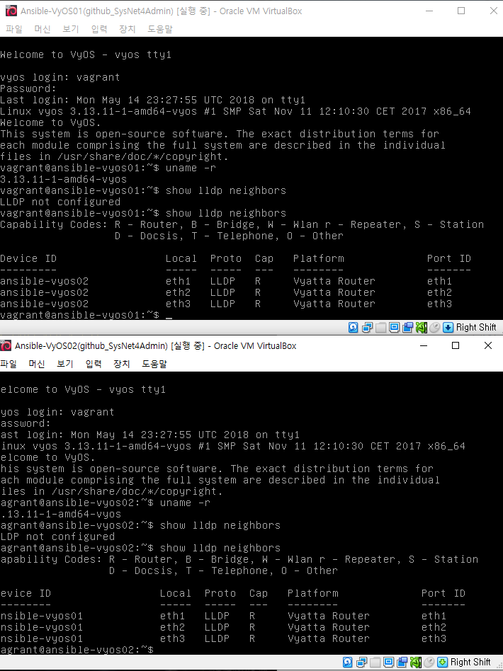 4장까지는 Hyper-V 환경에서 구성을 진행하였으나 Vagrant 자체에서 Hyper-V용 Box를 지원하지 않는 부분이 발견되면서 결국은 VirtualBOX로 전환하였습니다. 5장의 실습 OS인 VyOS도 지원하지 않음 ㅠㅠ