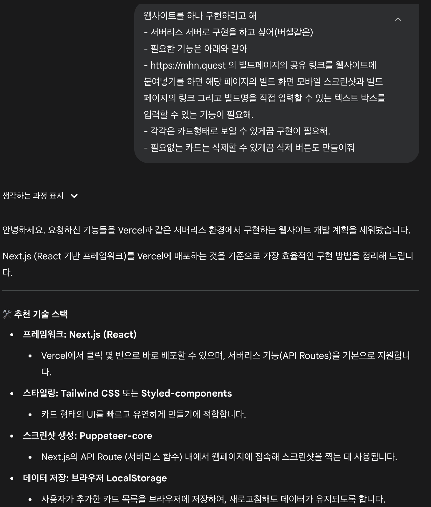 이왕 하는김에 안써본 버셀을 써보자고해서 물어보니 답을 받고 기술스택하고 구현방식에 대해서 알려줬는데