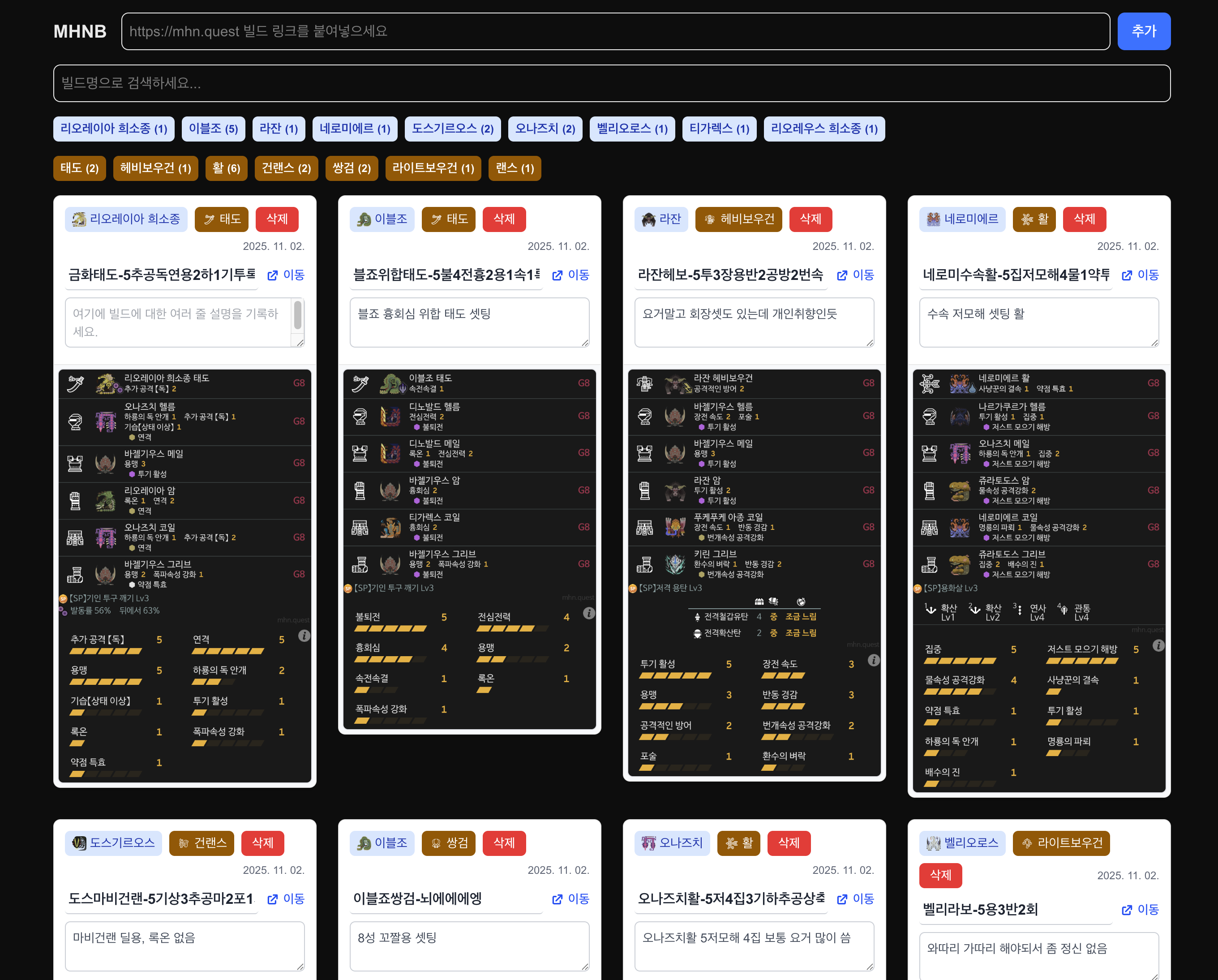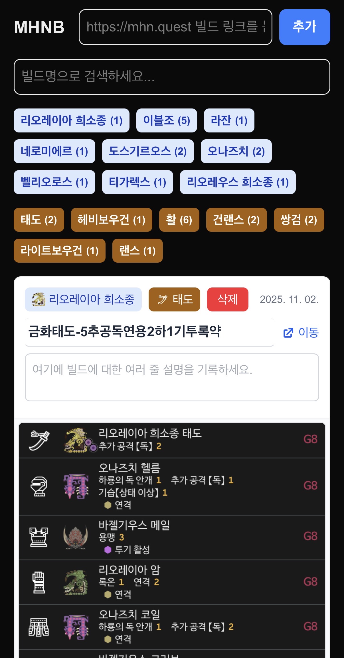 처음에 원했던 기능은 mhn.quest 에서 특정 빌드에 대한 링크를 제공을 해줘서 해당 링크를 넣으면 스크린샷과 함께 간단하게 검색 혹은 모아서 볼 수 있는 페이지를 만들고자 함 물론 아는사람들과 공유하기 위한 목적도 있었음