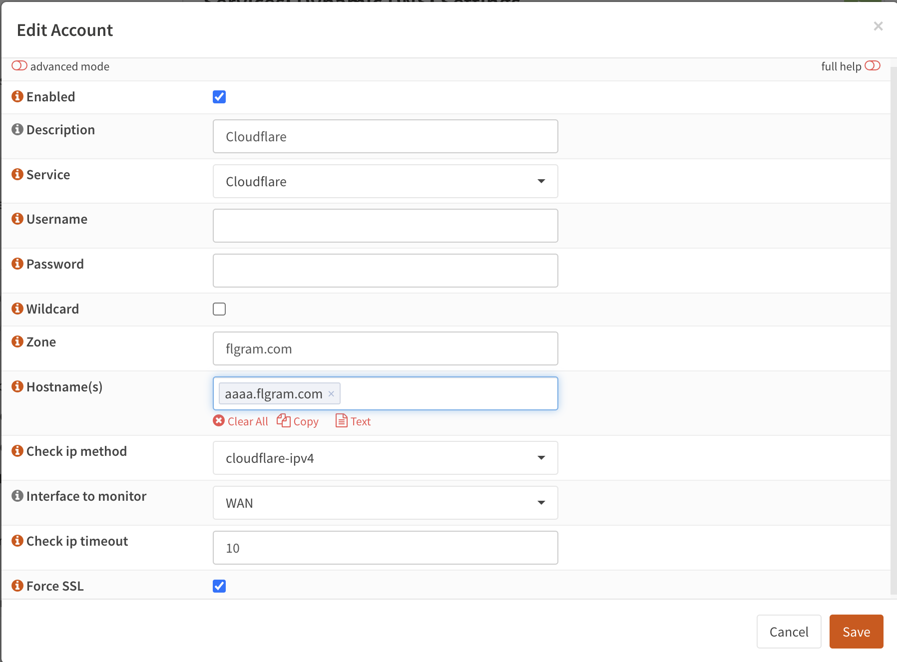 - Hostname : DDNS 적용이 필요한 호스트네임, 해당 호스트네임은 Cloudflare에 사전에 입력되어 있어야 함