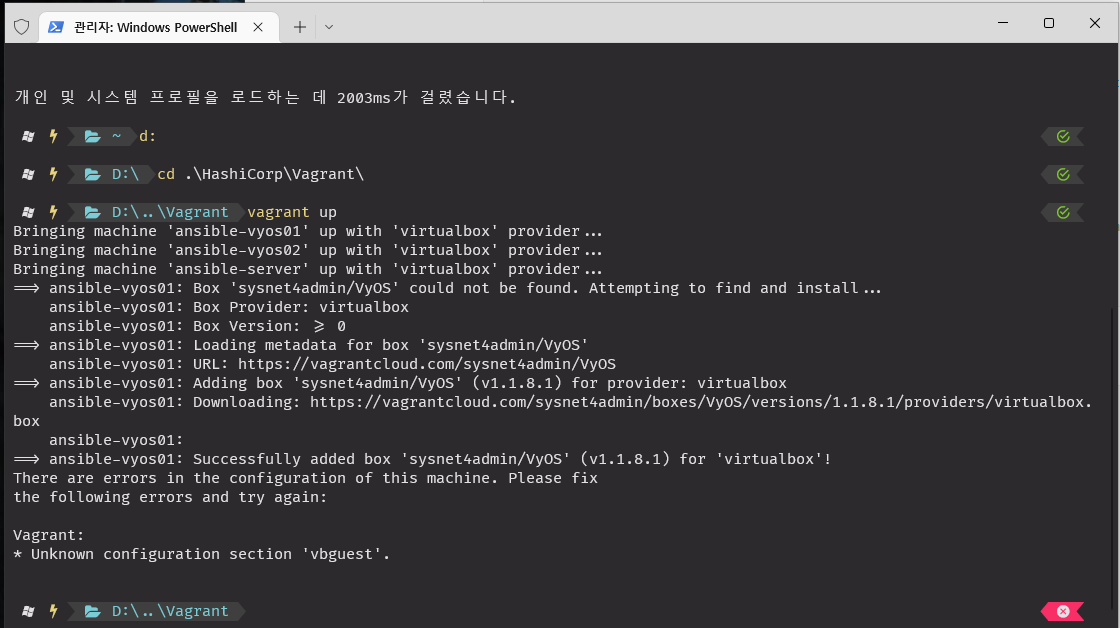 4장까지는 Hyper-V 환경에서 구성을 진행하였으나 Vagrant 자체에서 Hyper-V용 Box를 지원하지 않는 부분이 발견되면서 결국은 VirtualBOX로 전환하였습니다. 5장의 실습 OS인 VyOS도 지원하지 않음 ㅠㅠ